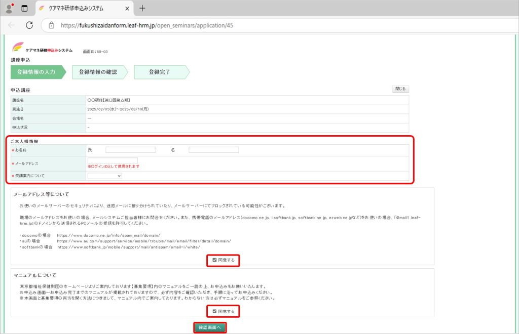 ① 仮登録画面で必要事項(氏名、メールアドレス)を入力し、同意事項を確認の上、「確認画面へ」をクリックします。
