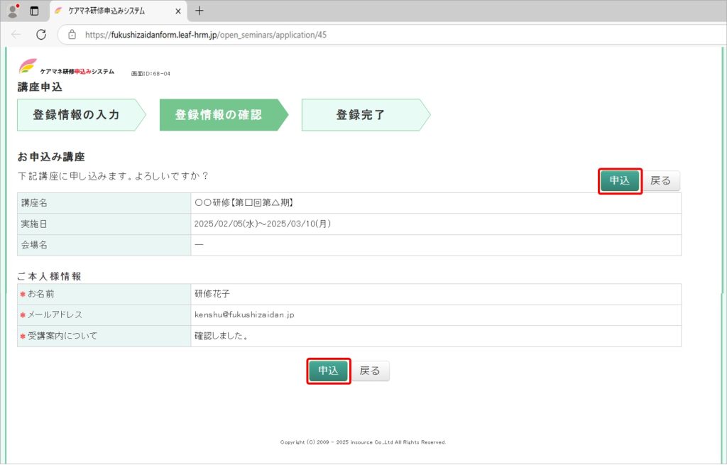 ② 記載内容に誤りがないことを確認し、「申込」ボタンをクリックします。