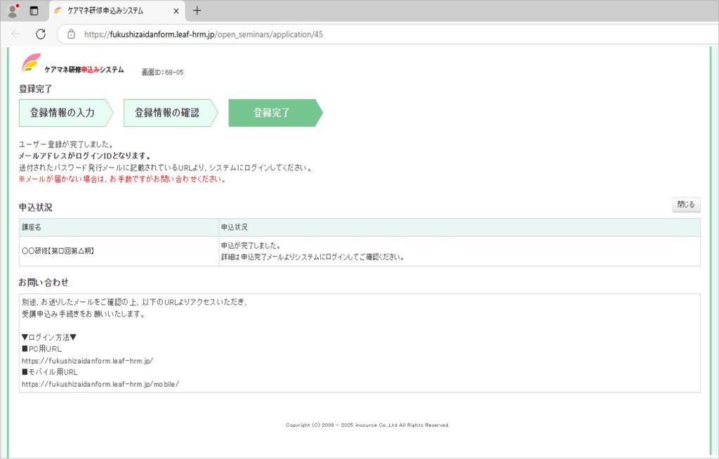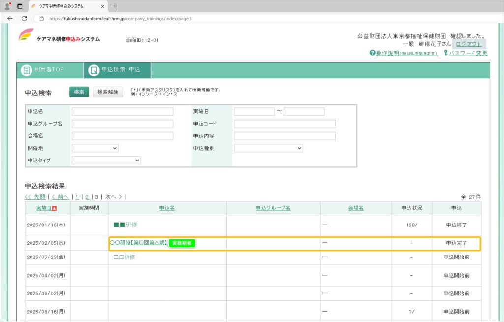 ※[申込検索・申込]には、ご自身が対象の研修の他、募集中、募集予定等の他研修も表示がされていますが、ご自身が対象の研修が「申込完了」になっていれば問題ございません。