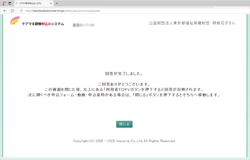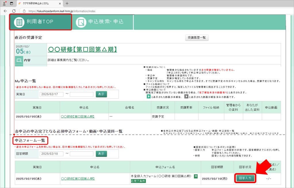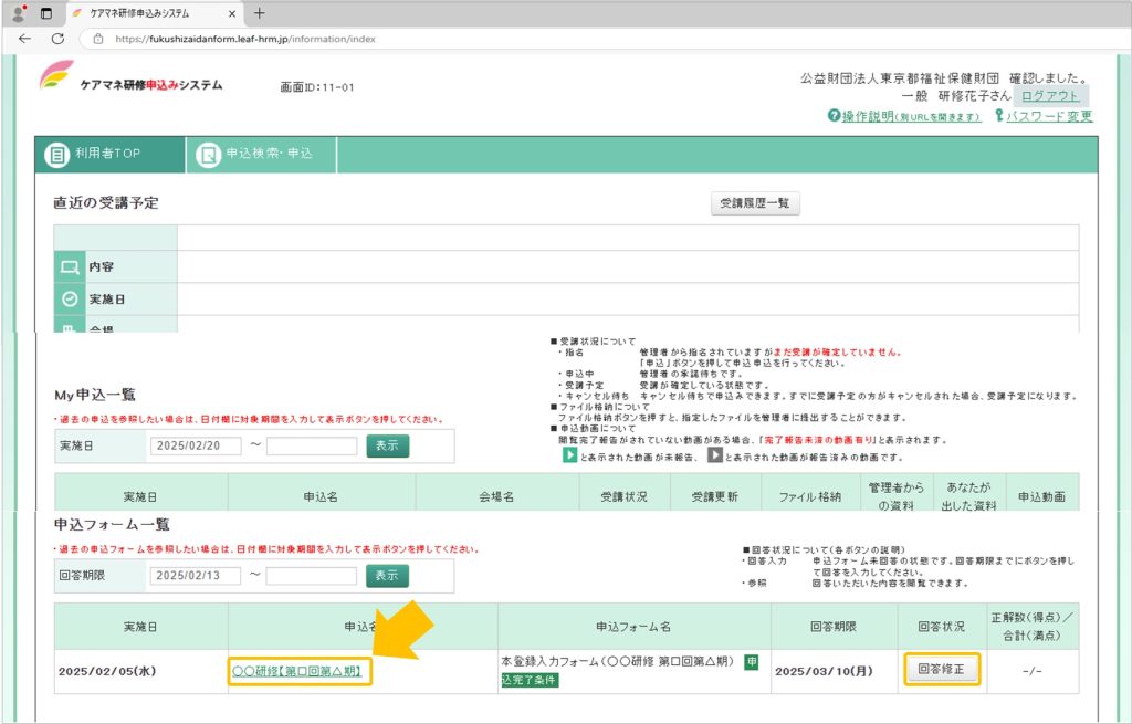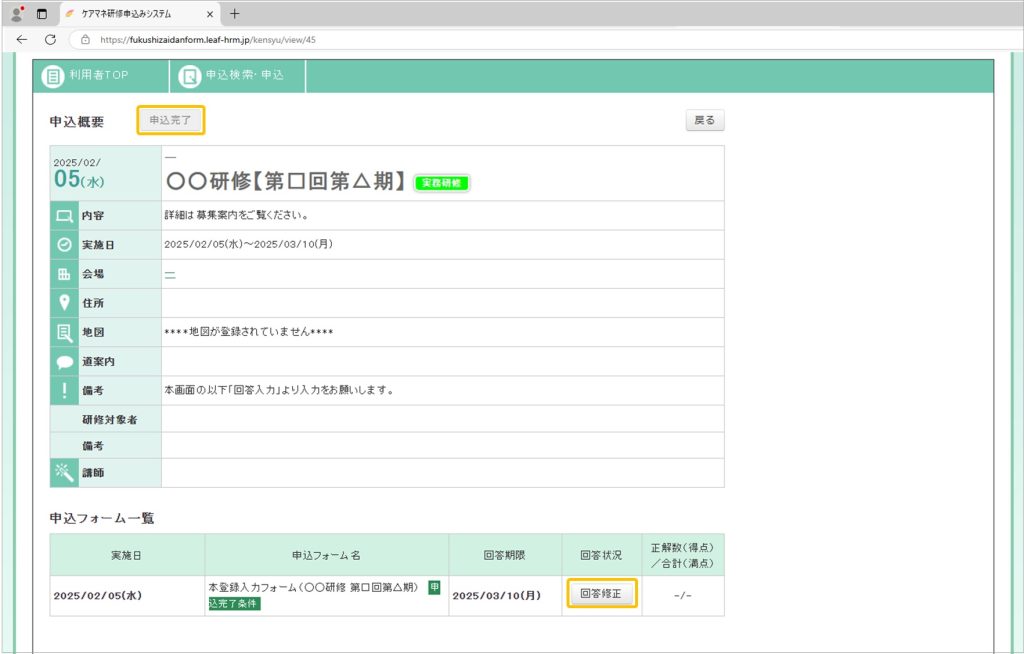 ① [利用者TOP]画面の[申込フォーム一覧]に表示されている研修の[回答状況]が「回答修正」になっていれば、申込は完了しています。