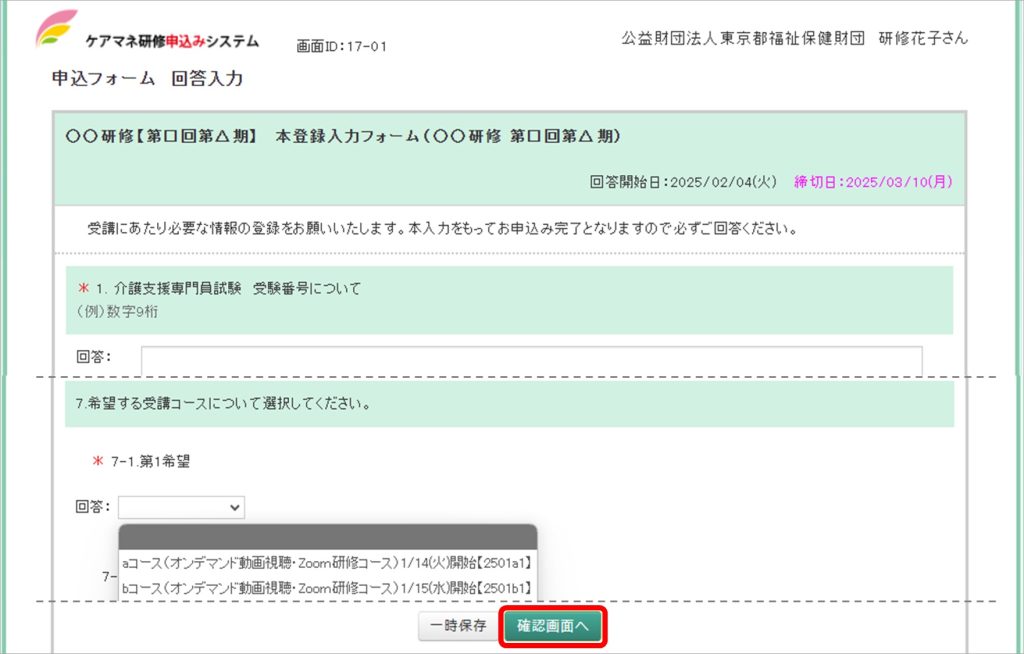 ④ [申込フォーム 回答入力]画面が開きます。各設問に従い、必要事項を入力します。最後まで入力し終えたら、画面最下部にある「確認画面へ」をクリックします。