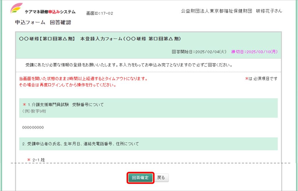 ⑤ [申込フォーム 回答確認]画面が開きます。記入した内容に間違いがないか、最終確認を行い、「回答確定」をクリックします。