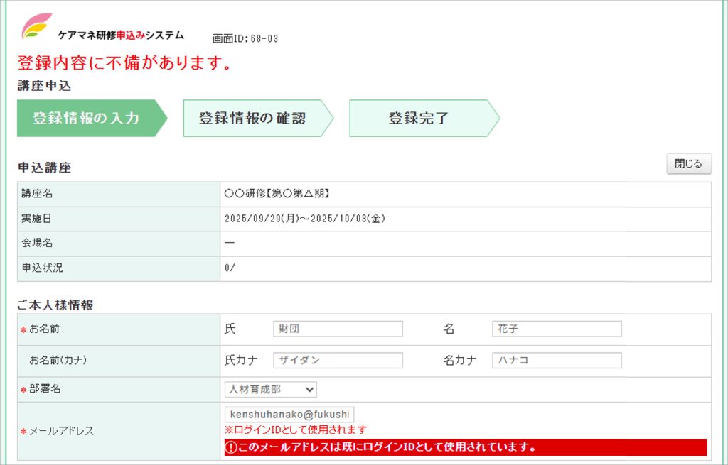 ➡「登録内容に不備があります。」「このメールアドレスは既にログインIDとして使用されています。」とエラー通知が出た場合、メールアドレスは正しく登録されております。次の、②の手順をお確かめください。