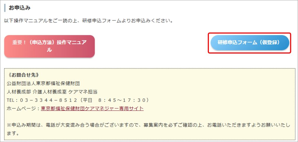 ① 募集案内に記載の内容をよく確認し、「研修申込フォーム(仮登録)」をクリックします。