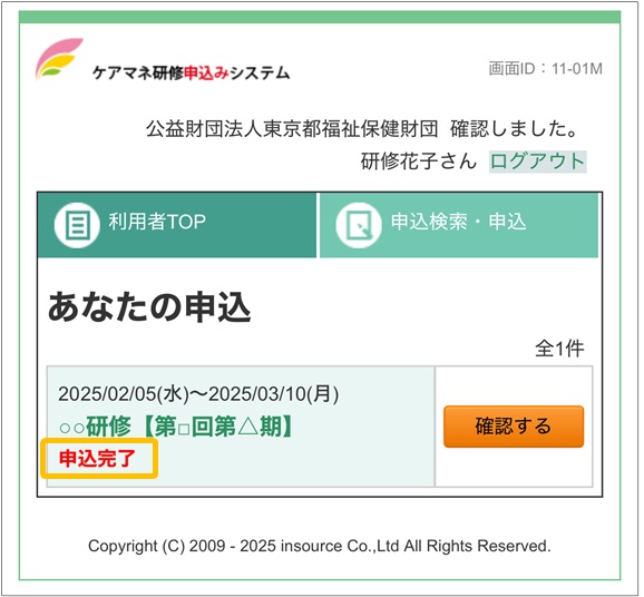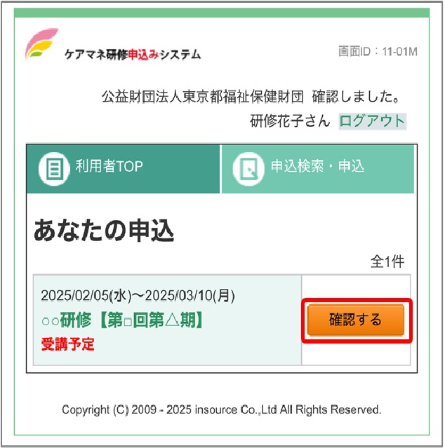 ② 利用者TOP画面に表示される[あなたの申込]に表示されている研修の「確認する」をクリックします。