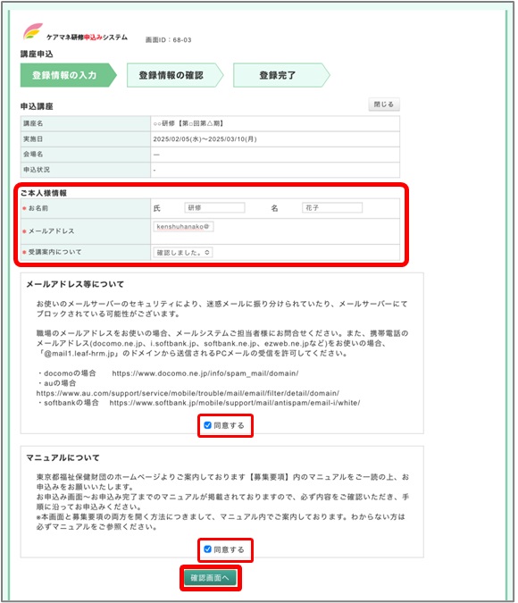 ① 仮登録画面で必要事項(氏名、メールアドレス)を入力し、同意事項を確認の上、「確認画面へ」をクリックします。