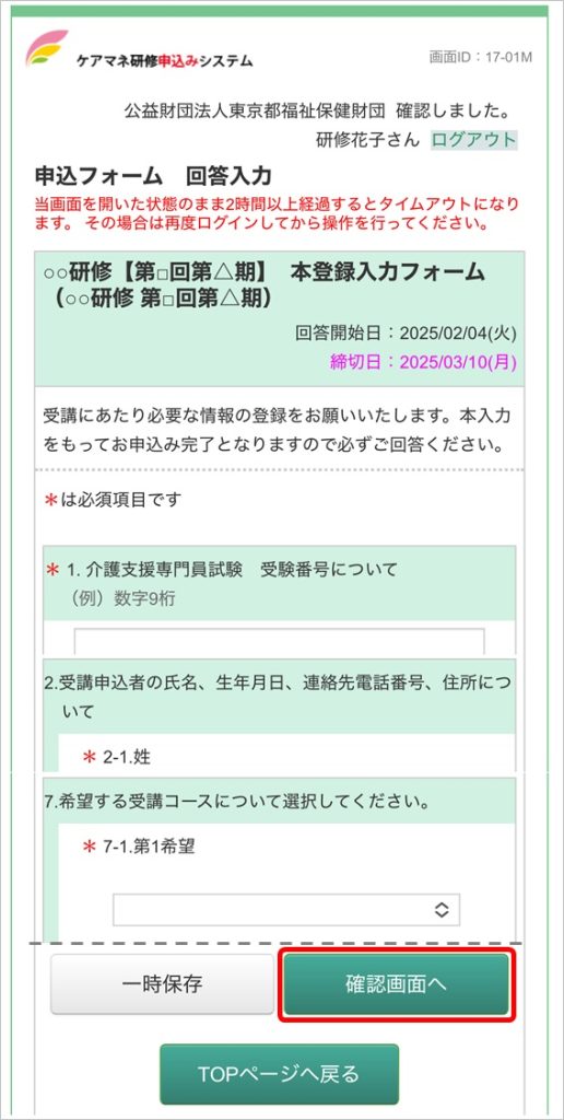 全ての項目の記載が完了したら、画面下部の「確認画面へ」をクリックします。