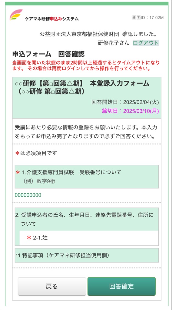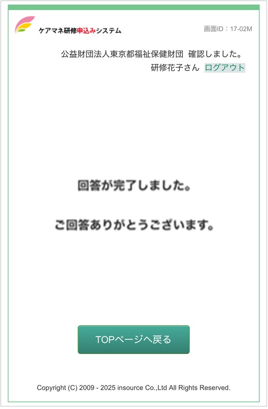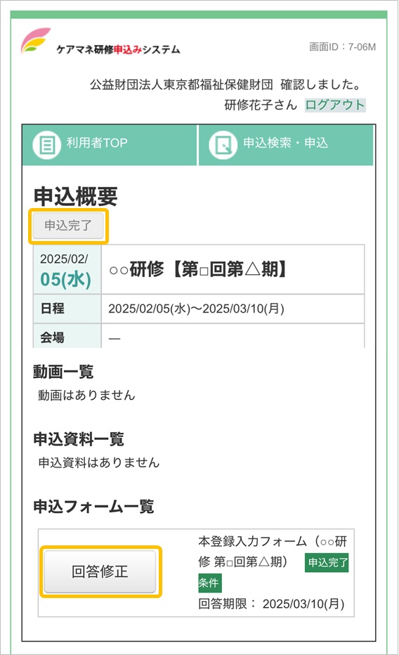 ① [利用者TOP]画面の[申込フォーム一覧]に表示されている研修の[回答状況]が「回答修正」になっていれば、申込は完了しています。