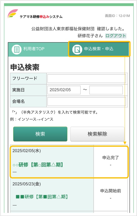 ※[申込検索・申込]には、ご自身が対象の研修の他、募集中、募集予定等の他研修も表示がされていますが、ご自身が対象の研修が「申込完了」になっていれば問題ございません。
