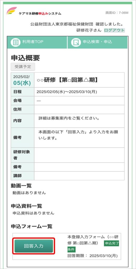 ③ 研修概要の画面に切り替わります。画面下部に[申込フォーム一覧]がありますので、「回答入力」をクリックします。