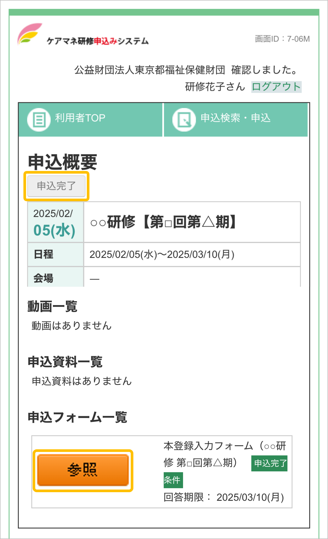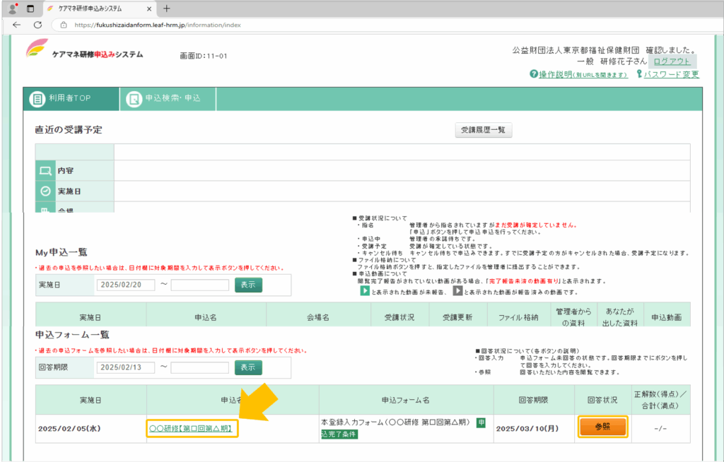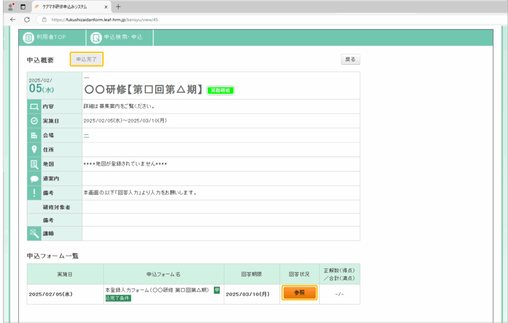 ① [利用者TOP]画面の[申込フォーム一覧]に表示されている研修の[回答状況]が「参照」になっていれば、申込は完了しています。