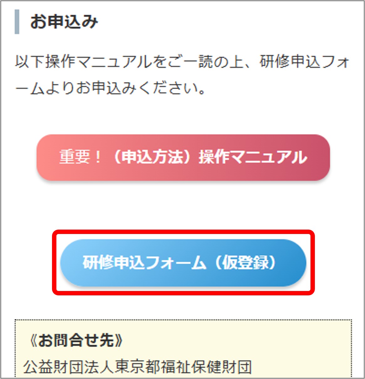 ① 募集案内に記載の内容をよく確認し、「研修申込フォーム(仮登録)」をクリックします。