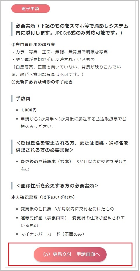 【5】「(A) 更新交付 申請画面へ」のボタンを選択し、「電子申請システム」へ移動します。
