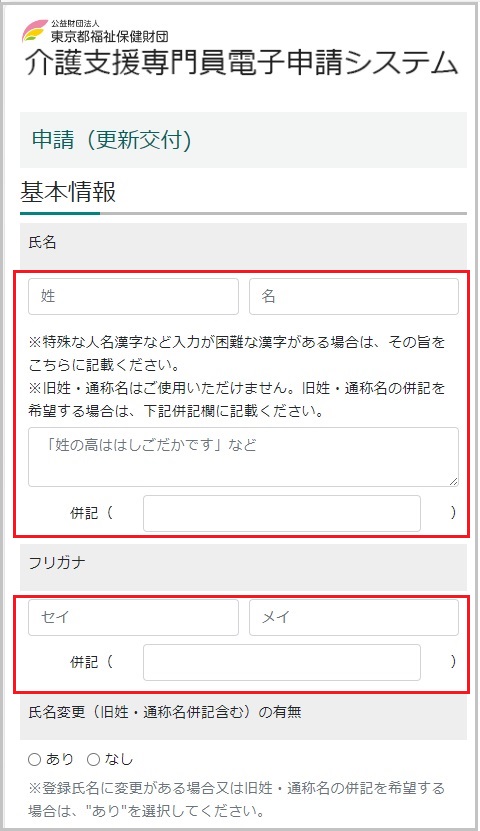 【11】氏名・フリガナを入力します。(特殊な漢字や外字等、パソコンやスマートフォンで入力できない場合は備考欄に記入してください。)