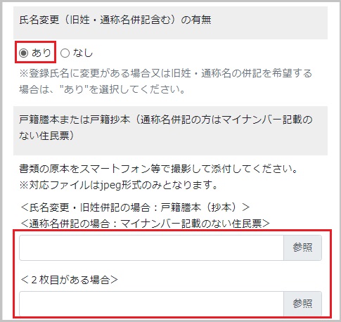 【12】氏名変更(氏名・通称名併記を含む)がある場合、氏名変更の有無で「あり」を選択し、戸籍抄本(謄本)(3か月以内に交付)を添付します。
