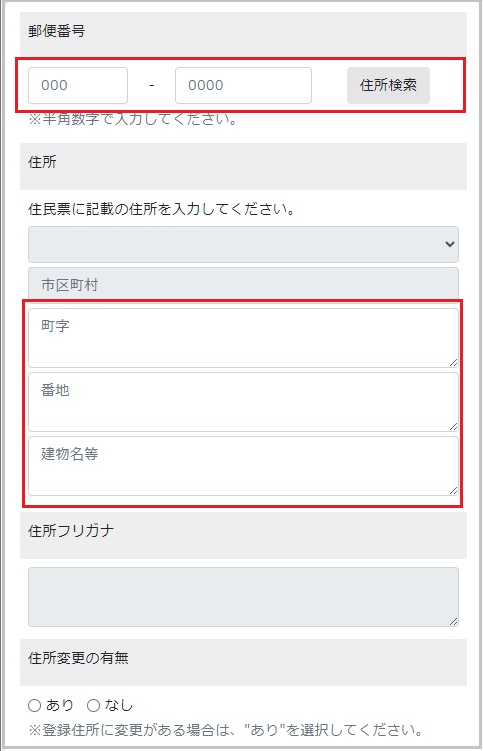 【16】住所を入力します。郵便番号入力後、住所検索を選択すると「丁目」まで自動入力されます。