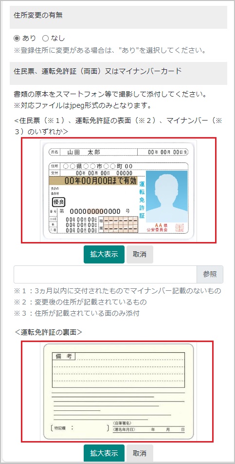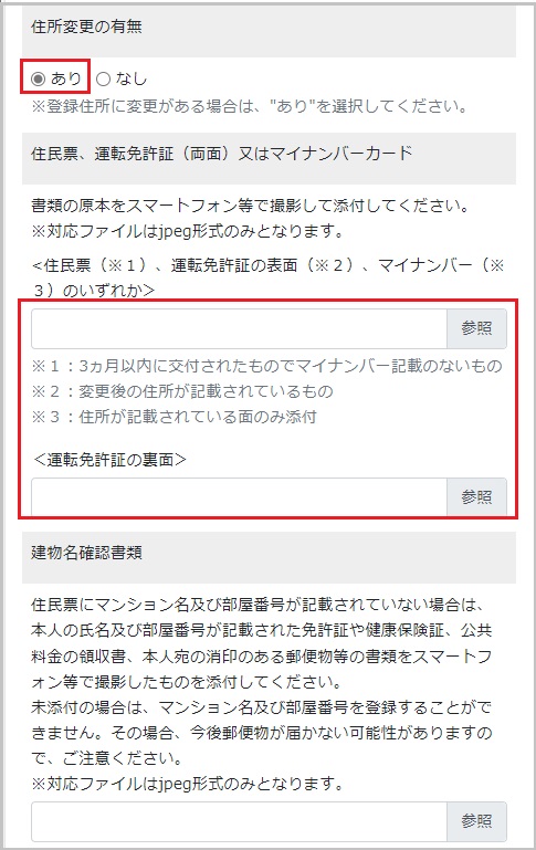 【17】住所変更がある場合、住所変更の有無で「あり」を選択し本人確認書類を添付します。