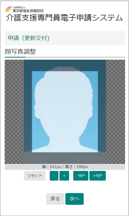 【24】顔写真調整では顔のサイズが調整ができます。上手く調整できない場合は調整せずそのまま添付してください。当財団で調整いたします。