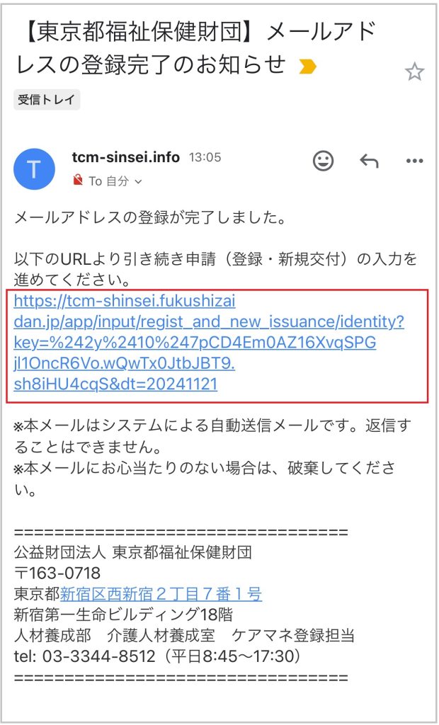 【9】財団から「メールアドレス登録完了お知らせ」メールを受信し、記載のURLから申請画面を起動します。