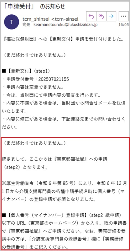 【28】財団から「申請受付のお知らせ」メールを受信します。続いてメール内URLから【Step2】個人番号(マイナンバー)申請手続き(東京都福祉局HP)に進みます。