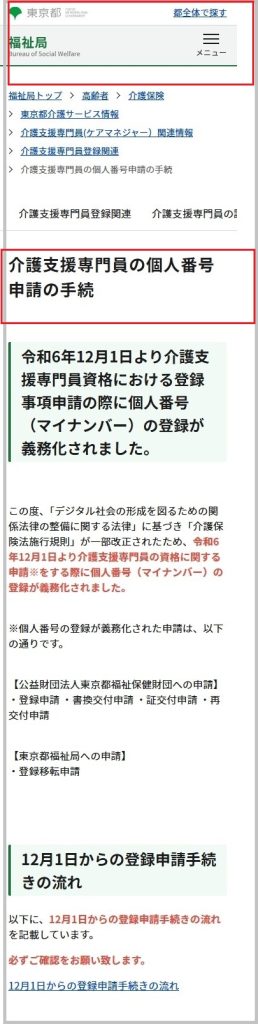 【29】東京都福祉局のホームページへ移動すると、「介護支援専門員の個人番号申請の手続」画面が表示されます。
